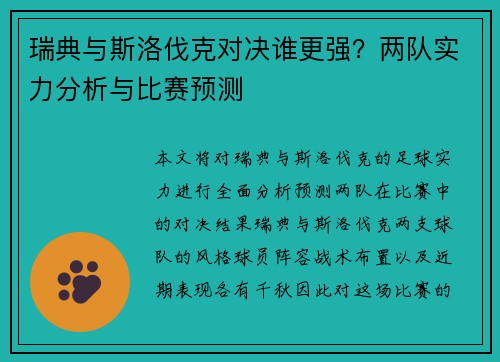 本文将对瑞典与斯洛伐克的足球实力进行全面分析,预测两队在比赛中的对决结果。瑞典与斯洛伐克两支球队的风格、球员阵容、战术布置以及近期表现各有千秋,因此对这场比赛的预判充满了不确定性。文章将从四个方面进行详细探讨:一是分析两队的历史战绩和整体实力;二是考察两队的阵容构成和球员个人能力;三是探讨两队的战术...