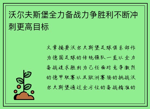 沃尔夫斯堡全力备战力争胜利不断冲刺更高目标